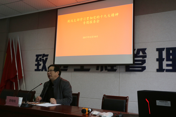 为深入学习宣传贯彻党的十九大精神,12月14日,致远支部邀请市委党校校委委员、市委宣讲团成员舒晓明到公司开展党的十九大精神专题宣讲。会议由致远支委姜元新主持,公司总部人员、项目部人员及全体党员共计50余人参加了报告会。