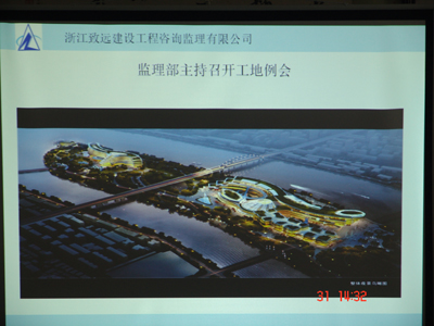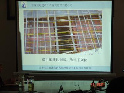 接着由我监理公司总监洪建功、相关专业人员张旭君、金程、金惠枫总结前一施工阶段存在的问题和需要注意的事项,我们把汇报做成PPT形式,图文并茂地展示在大家面前,与会者是个个全神贯注看着投影,再加上相关监理专业人员的精彩讲解,使大家对存在的问题和需要注意的事项一目了然,受到了与会者的一致好评。