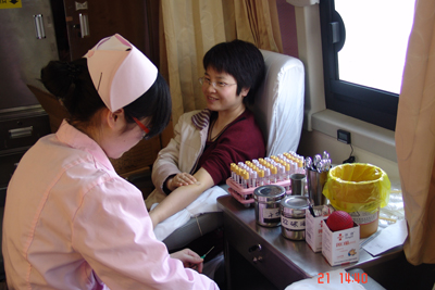 已经是第5次义务献血的共产党员、项目总监郑国健第一个高高挽起衣袖,以轻松的表情完成填表、体检、验血、献血过程,他的自信和勇敢感染了在场的同志,本来略显紧张的气氛一下子变得轻松起来,大家谈笑风生地排队填表、验血、抽血,一边为自己能对社会做一点力所能及的事感到满足和自豪;同时也用说笑的心情冲谈由于采血过程中产生的些许紧张心理。通过身体检查合格的同志是个个兴奋不已,而身体检查暂时不合格的同志,很是有些失落感,特别是从孝顺工地赶过来的夏令同志,感觉白跑了一趟,很是可惜,但大家都赶紧安慰他:“回去好好锻炼,下次还是有机会的。” 值得一提的是,看到献血车停在公司门口,试验所在罗季英总工的带头下也有三位同志加入了献血行列。