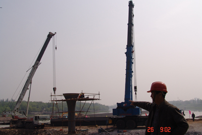 据燕尾洲景观公园工程致远监理部张福明介绍,本计划定于4月25日一次性连续起吊义乌江截流段上三段桥梁的,由于4月24日上游突涨大水,冲垮了义乌江截流段堤坝,只好改由两边分段起吊。根据金华历年汛期情况,燕尾洲景观公园工程指挥部要求在5月15日前将义乌江和武义江上的桥梁安放完毕,保证汛期通水。