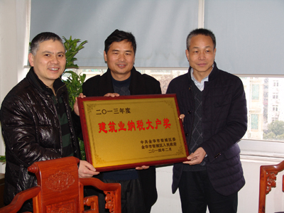 3月6日上午,金华市婺城税务分局有关人员在市住房和城乡建设局副局长张太木的带队下来我公司进行调研,并带来了“建设系统纳税大户奖”奖牌。