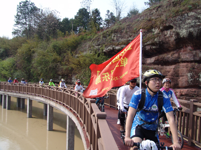浙中绿道开启仪式骑行队伍通过栈道