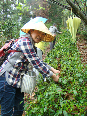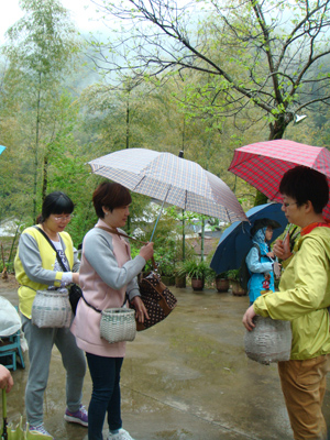 车队沿着安琴公路徐徐前行,途经安地、郑宅、山道、琴坛至南坑,用时一个半小时。如此规模的队伍到来,使原本幽静的南坑村顿时热闹了起来。下得车来,放眼望去,周围群山环绕,云雾飘渺其间,山峰若隐若现,人置其中,宛若仙境一般。欢呼雀跃的人群跨过小溪,沿着石径小路拾阶而上,首先来到村邹支书家,热情的主人拿出采茶篓和编织袋,把队伍分编成两队,一队围上茶篓上前山采茶,一队拿着编织袋上后山挖笋。随后,队伍浩浩荡荡分两路进军山中。采茶的以妇女和儿童居多,挖笋则以男同胞为主。采茶的一队跨过小溪,沿着山间小路蜿蜒而上,约行一公里,一有坡度的梯形茶园展现在人们的面前,大家迫不及待围着茶树就采起茶来了,虽然天空下着毛毛雨,大家却兴致很高,不一会,每个人都有不少的收获。挖笋的一队则直上后山毛竹林,因为坡较陡,性急的人因此被滑倒,但竹笋美味的诱惑,挡不住他们找笋的热情,个个争先恐后,有人收获还是挺丰的。