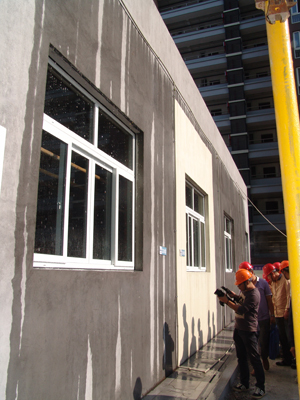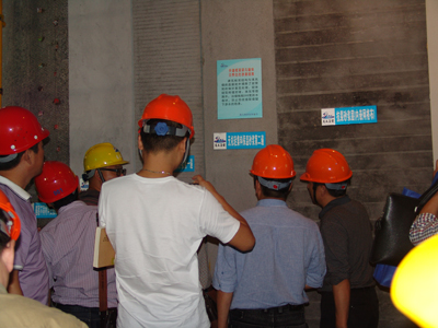 会议第三项是现场观摩。与会人员进入金品小区二期3#、5#、6#观摩区进行观摩,观摩区展示了工作交底示范墙、内外墙施工工艺、窗体淋水实验、楼梯踏步饰面、卫生间防渗漏、门口板底部挡水、地地砖湿贴、墙地面网格布等示范区,让人受益不浅。