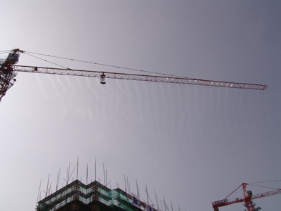 高层建筑施工现场塔吊的吊臂喷雾场景