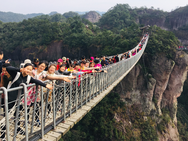 经过一晚的休整,3月10日,是此行的第三站,也是本次活动的重头站一一游览神仙居景区。也许是致远女神们的人品好,昨晚还是雨天,早上起来却是一个碧海蓝天的大晴天。吃过早餐后,会同仙居分公司的女神们坐半小时车程来到了国家级森林公园神仙居。首先映入眼帘的是奇峰奇石,蔚为壮观。然后我们乘索道上山,真是一览众山小,到山顶,群山尽收眼底,什么”西罨慈帆”、”画屏烟云”、“佛海梵音”、”千崖滴翠”、”犁冲夕照”、”风摇春浪”⋯⋯美不胜收!不愧是景色秀丽的人间仙境。景区内负氧离子含量奇高,平均达2.1万个/每立方厘米,最高处达8.8万个/每立方厘米,是名副其实的天然氧吧。
