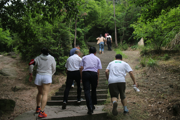 随着出发的号子一响,我们的队员就像箭一样冲在前面,过一会儿,又像风一样快速消失在开始的登山道上。我们的陆雪同志,为了走“捷径”,上野路、抄小径,荆棘灌木难不倒她,陡坡高涯奈何不了她,她时而蛇行穿梭,时而“四脚”并用,虽中间曾迷失了一段距离,但最后还是取得了良好的战绩。其他人员则跟随着大部队,从石阶处攀登,面对如林强手,我队员没有气馁,紧紧咬住了广福医院强队,毫不懈怠。特别值得一提的是,作为后补队员的吴珂菁,原本想跟着比赛人员登一程锻练锻练,中途却遇上我队员何广飞吃力的模样,毅然接过他的那一棒,向登顶发起冲刺,并取得了不错的成绩,为团体排名第二立下了汗马功劳。