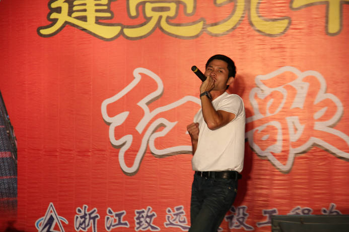 金华金东区泉源村改造项目部陈波演唱歌曲《红旗飘飘》